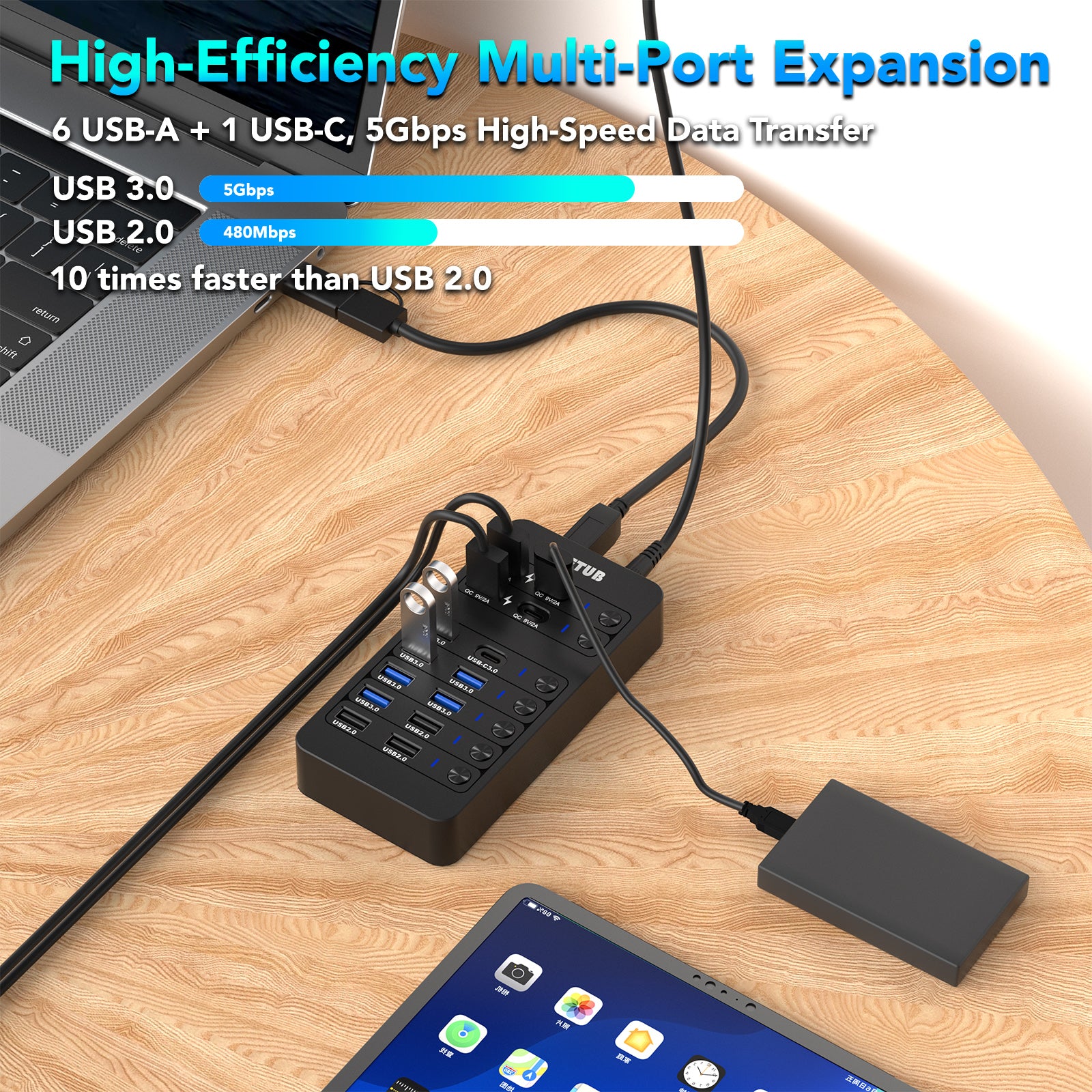 【14-Port Versatile Design】 OseTub 14 Port Powered USB HUB includes 6 USB 3.0 high-speed ports(5Gbps), 3 USB 2.0 ports (480Mbps), 2 USB-A/USB-C fast-charging ports(9V/2A), 1 USB-C 3.0 data port(5Gbps), and 1 USB 3.0 Type-B port (5Gbps) to meet all your connectivity needs.