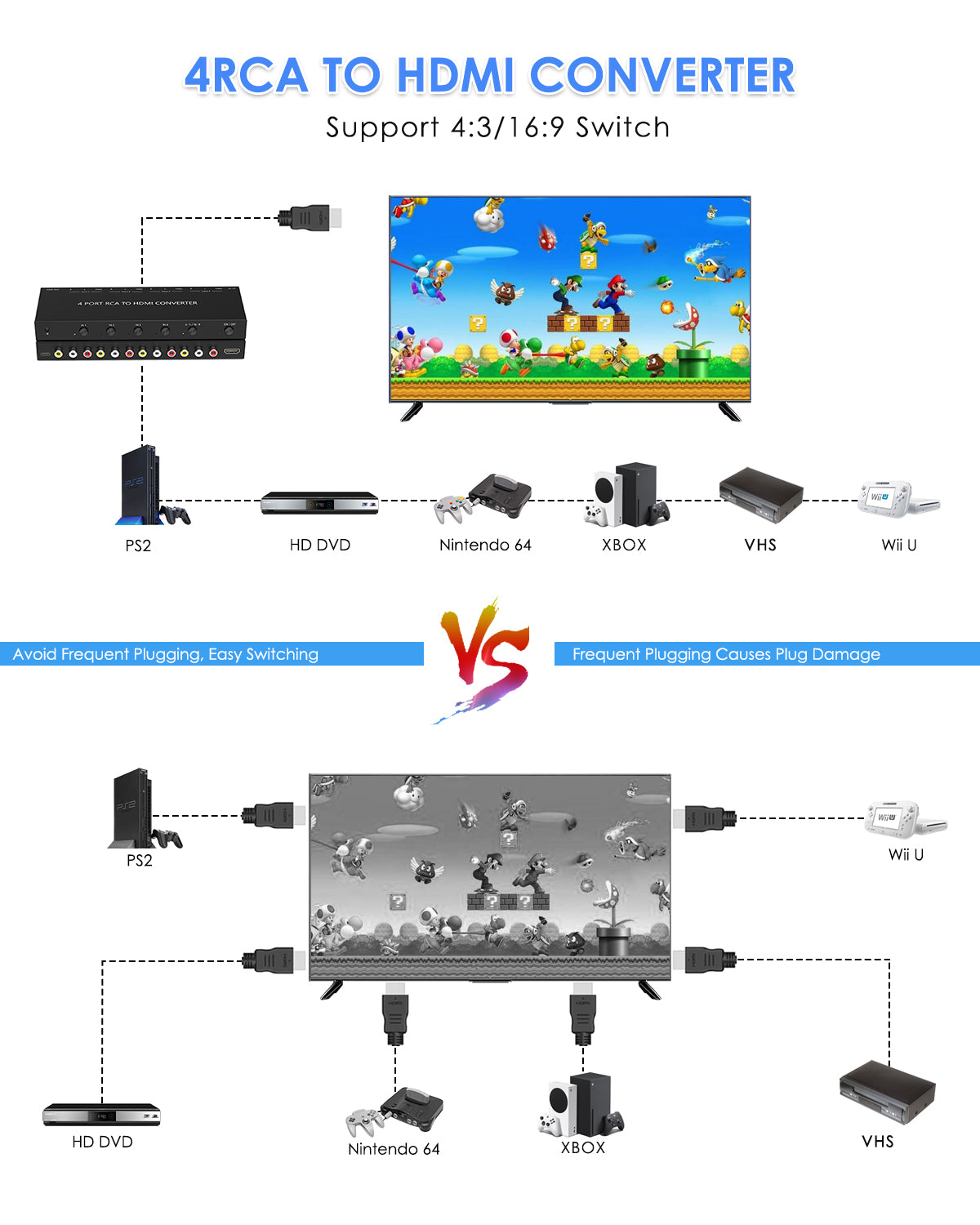 【4 PORT RCA to HDMI CONVERTER】Connect up to 4 composite RCA devices to a single HDMI port with this 4 port RCA to HDMI converter, dual AV to HDMI converter supports 16:9/4:3 aspect ratios for seamless compatibility with your TV or display device.