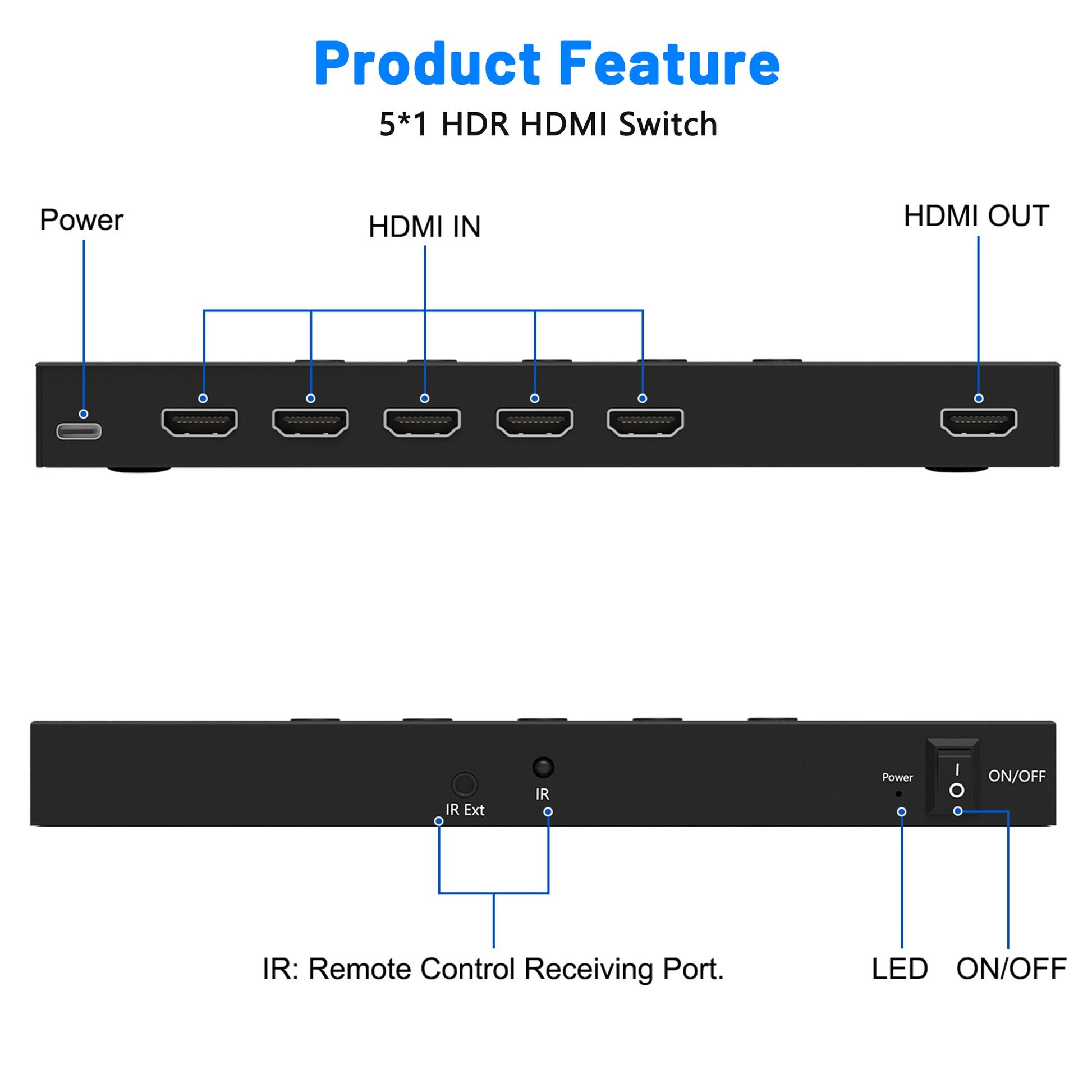 4K@60Hz 5 in 1 out HDMI Switch, 5 Port HDMI Switcher Selector Support HDR10 & HDCP 2.2 & Full 3D with IR Remote Control and ON/OFF Switch for Nintendo Switch,Xbox PS5/PS4,Fire Stick,Roku,Apple TV