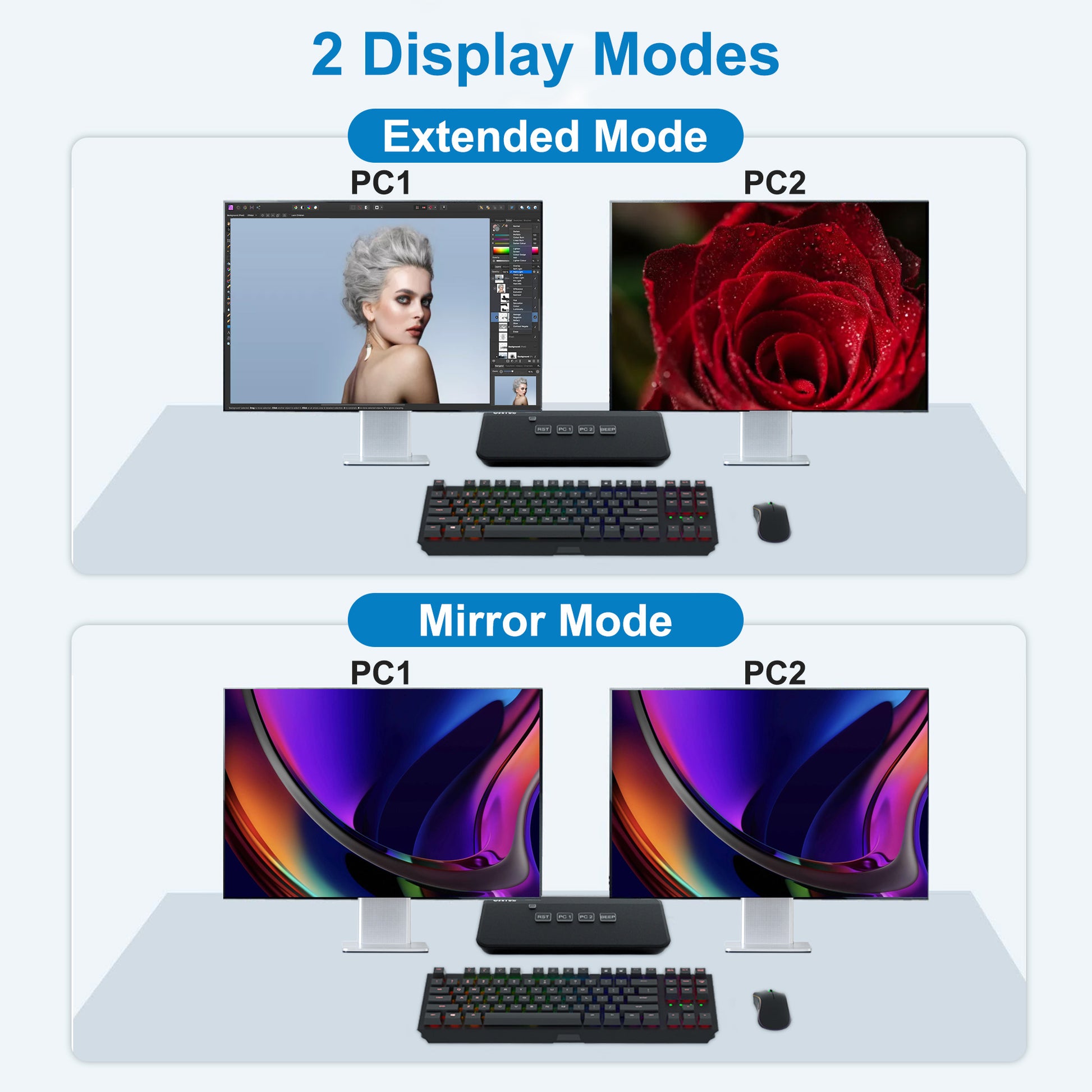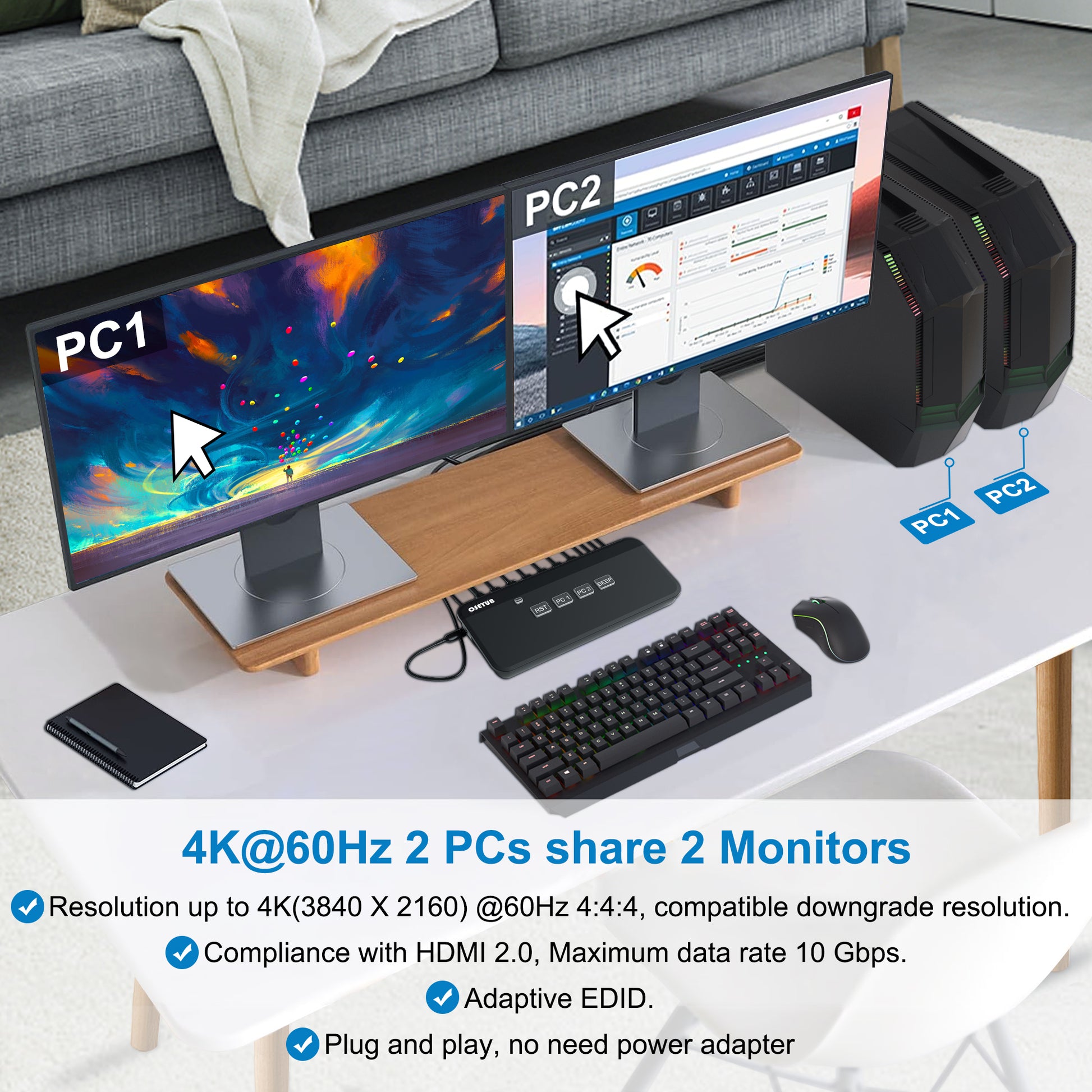 【4K 60Hz HDMI KVM Switch Dual Monitor】This kvm switch can help you use one set of keyboard and mouse to control 2 computers and share 2 monitor. High-precision encryption chip, gold-plated interface, high compatibility, best choice for improve office efficiency.