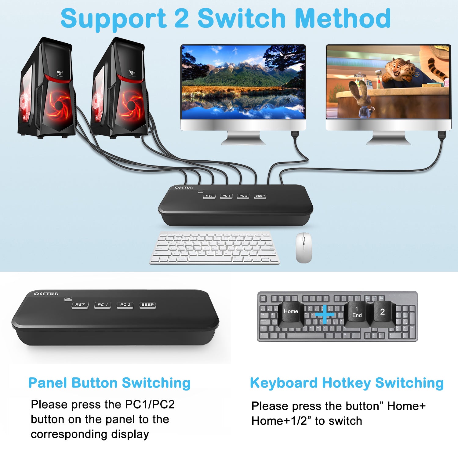 【Support 2 Switching Methods】① Button Switch; ② Keyboard Hotkey Switch; The device is equipped with a switch button, if you need to switch to the corresponding display, just press the corresponding button. Use hotkey switch need to insert the keyboard and mouse into the HDMI KVM Switch dual monitor USB ports on the panel. (Hotkey switch: Home+Home+1/2, press home button twice and press 1, then switch to PC1; press home button twice and press 2, then switch to PC2).