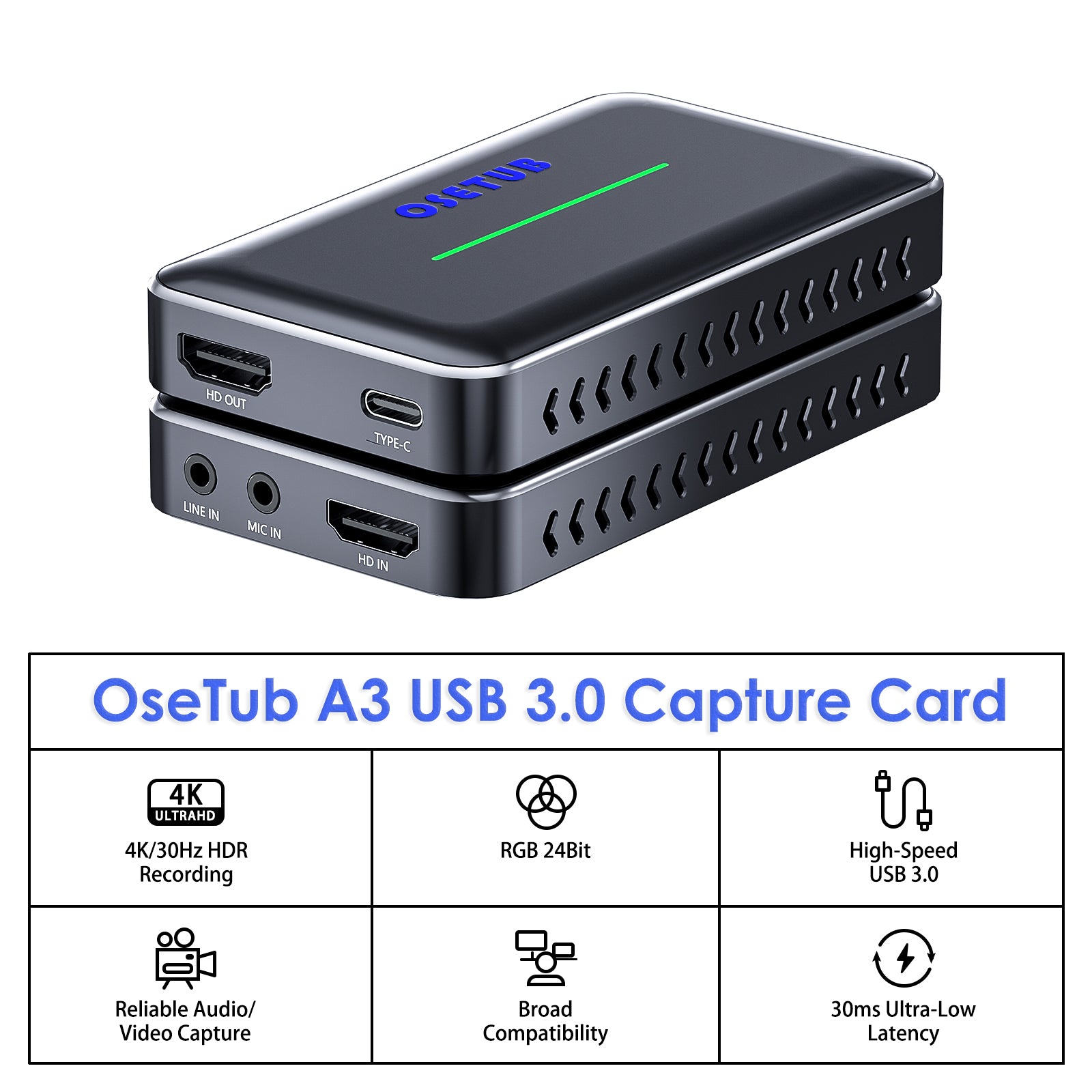 【High-quality Video Capture】The OseTub USB3.0 video capture card allows you to capture a single HDMI input signal and supports HDMI loop-through at the same resolution. It supports resolutions up to 4K/60Hz, ensuring crisp and clear video capture.