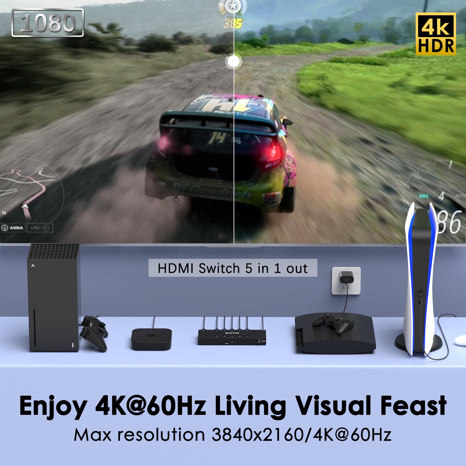 4K@60Hz 5 in 1 out HDMI Switch, 5 Port HDMI Switcher Selector Support HDR10 & HDCP 2.2 & Full 3D with IR Remote Control and ON/OFF Switch for Nintendo Switch,Xbox PS5/PS4,Fire Stick,Roku,Apple TV