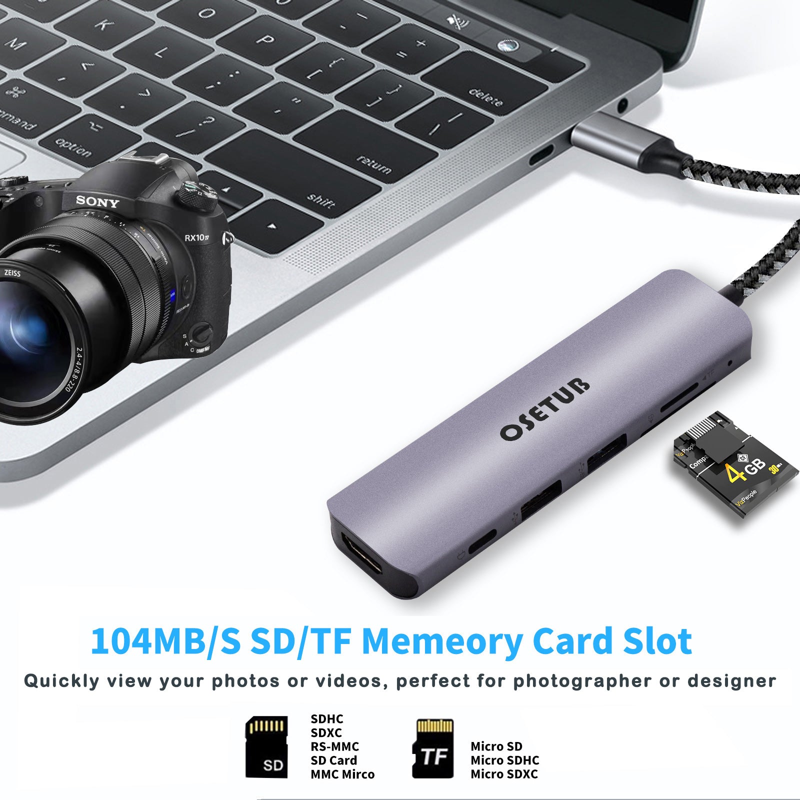 - 【100W Power Delivery & SD/TF Card Reader】100W power delivery charging port allows you to charge your computer, ideal for MacBook Pro/Air or and other USB C devices, your primary choice of USB C Hub. SD/TF Card Reader can be used at a fast transfer speed up to 104M/s, easy to transfer photos shooting or videos by your camera from cards to laptop in just seconds.