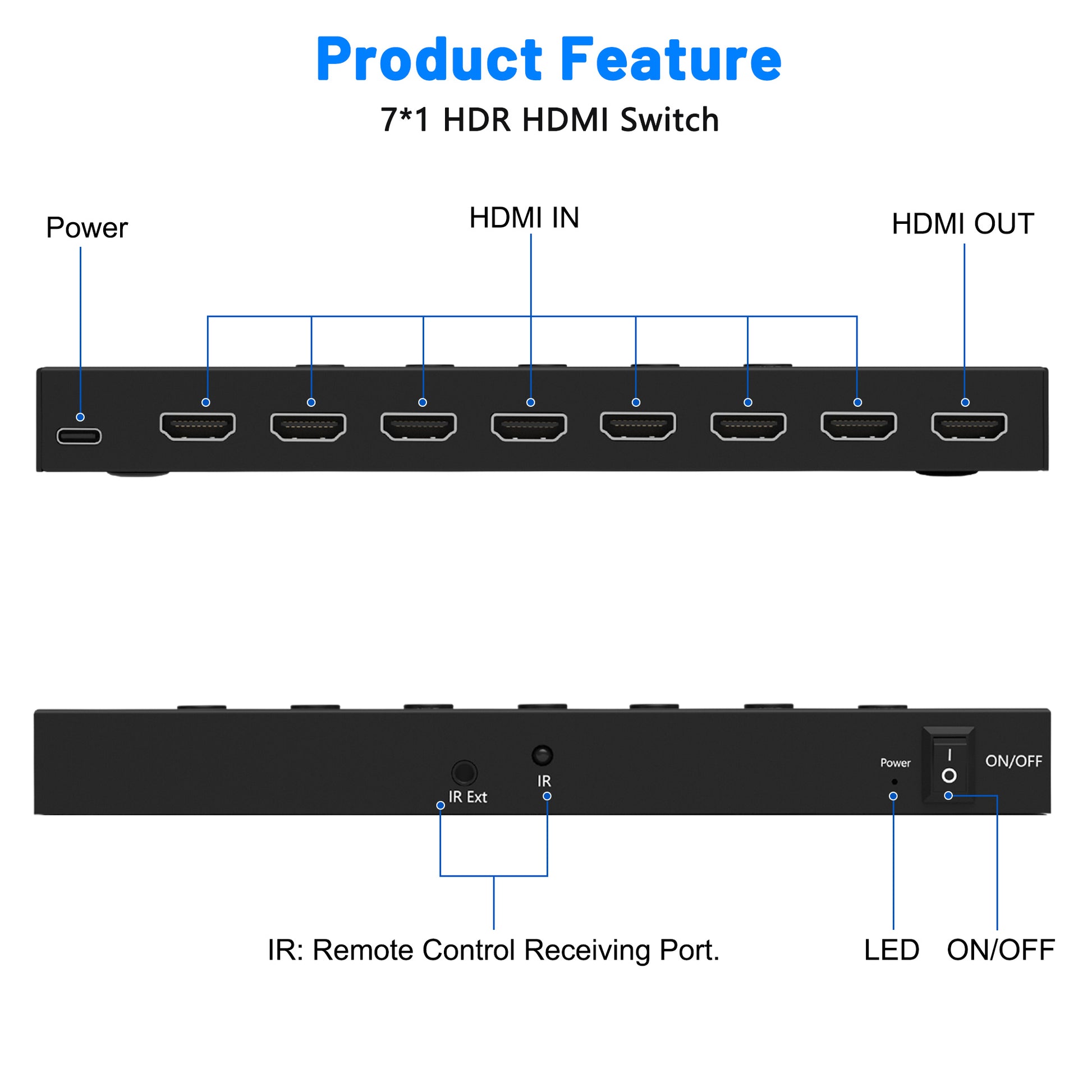 4K@60Hz 7 in 1 out HDMI Switch, 7 Port HDMI Switcher Selector Support HDR10 & HDCP 2.2 & Full 3D with IR Remote Control and ON/OFF Switch for Nintendo Switch,Xbox PS5/PS4,Fire Stick,Roku,Apple TV