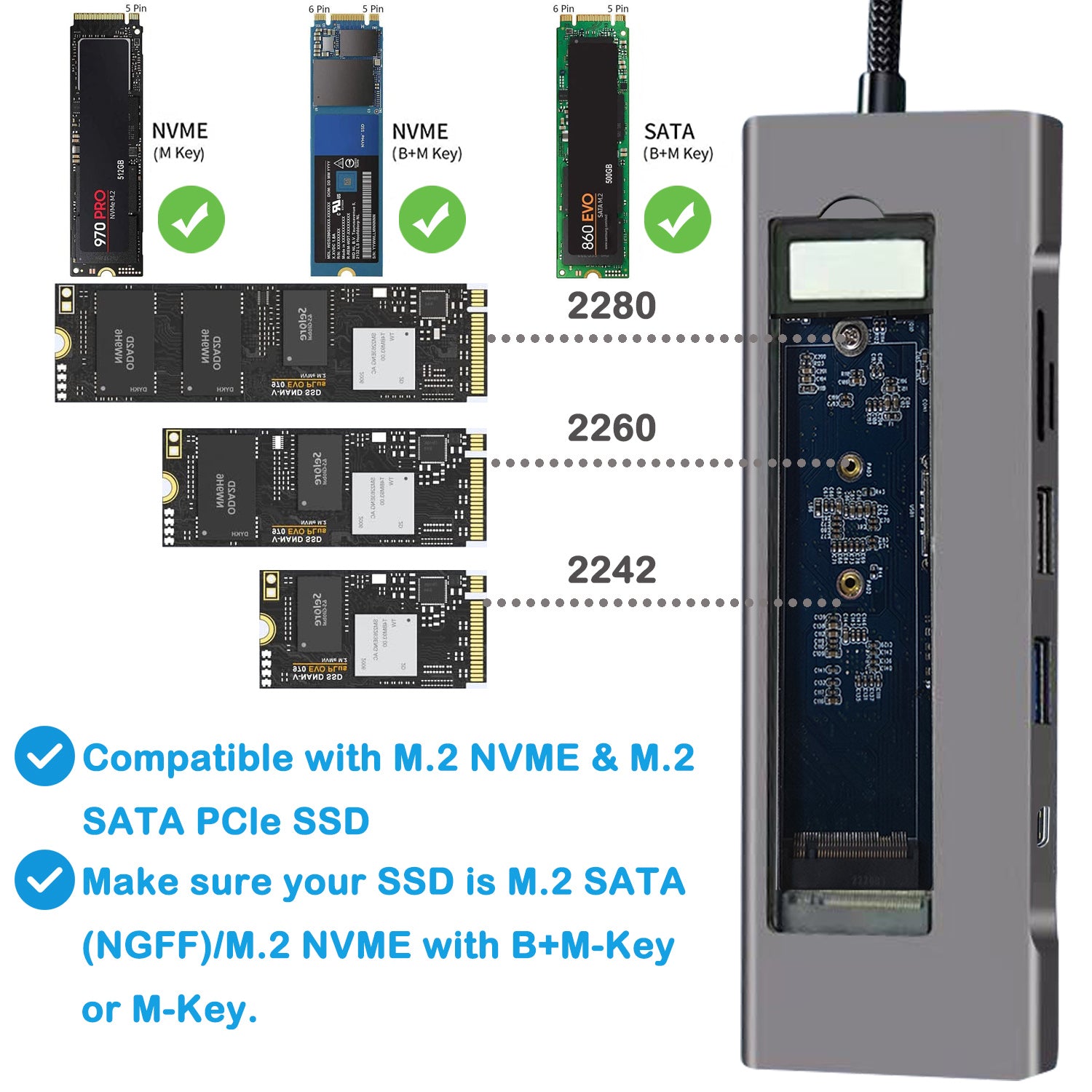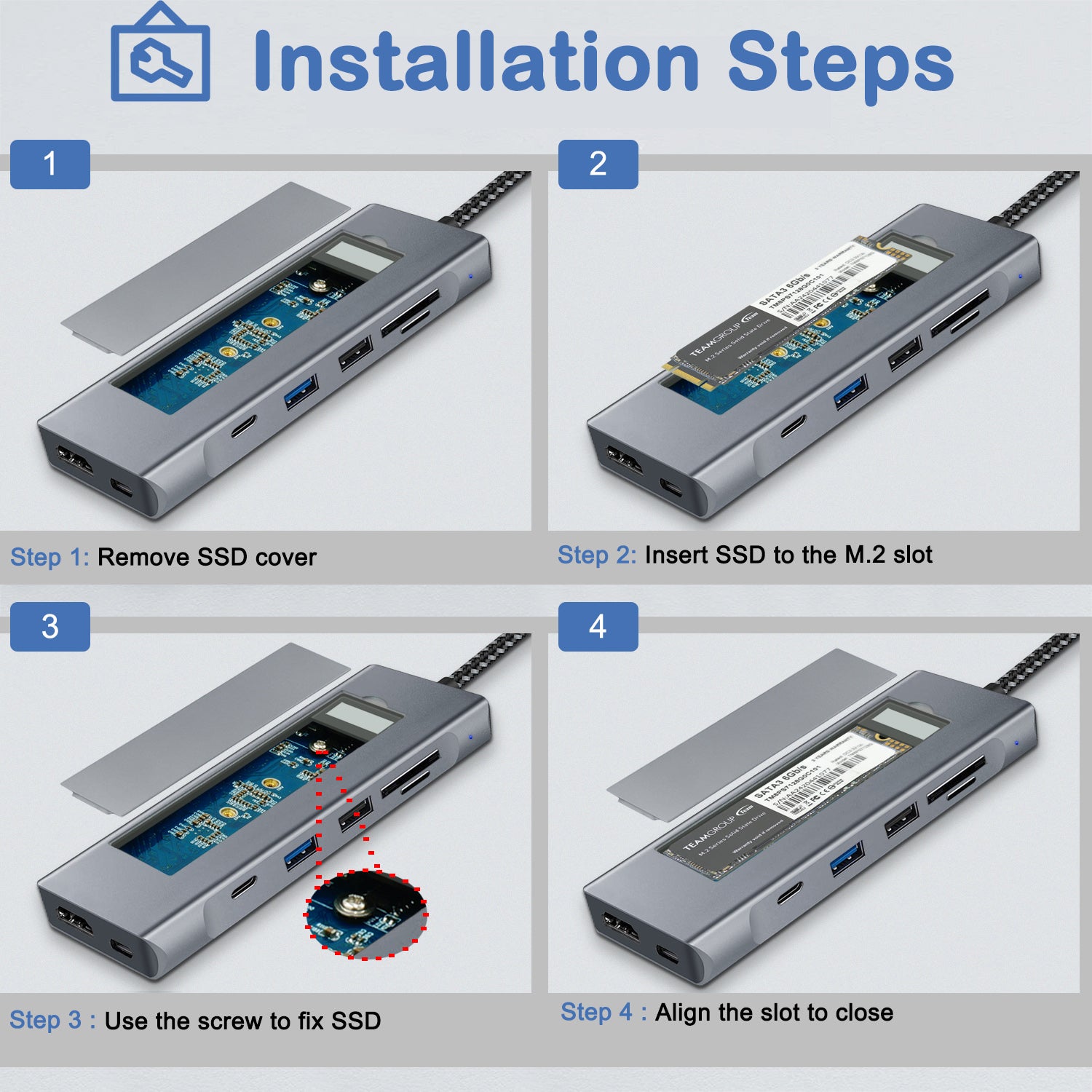 - 【8-in-1 USB-C Hub Combines M.2 SATA SSD Enclosure】The intelligent USB C hub adapter has perfectly combined all the functions you need. Included 4K High Definition port, 2 USB 3.0 ports, 1 USB 2.0 Port, 100W PD charging ports, SD and TF Card Reader. Combines the M.2 SATA SSD Enclosure and Multi-functional TYPE-C Adapter Compatible for MacBook, Type C laptop, Samsung Note10/S10, Huawei P30/Mate30.