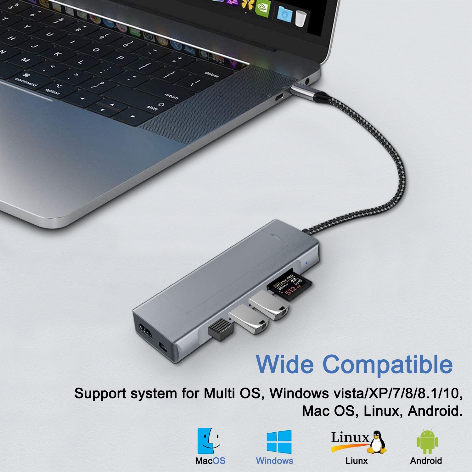 - 【100W Power Delivery & SD/TF Card Reader】100W power delivery charging port allows you to charge your computer, ideal for MacBook Pro/Air or and other USB C devices, your primary choice of USB C Hub. SD/TF Card Reader can be used at a fast transfer speed up to 104M/s, easy to transfer photos shooting or videos by your camera from cards to laptop in just seconds. Plug and Play, No Software, Drivers required.